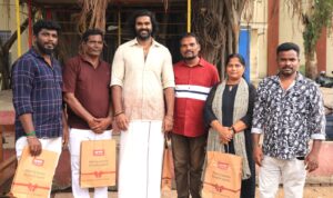 ‘கொம்புசீவி’ படப்பிடிப்பு நிறைவை முன்னிட்டு படக்குழுவினர் அனைவருக்கும் புதிய உடைகள், பிரியாணி வழங்கி கௌரவித்தார் சின்ன கேப்டன் சண்முகபாண்டியன்